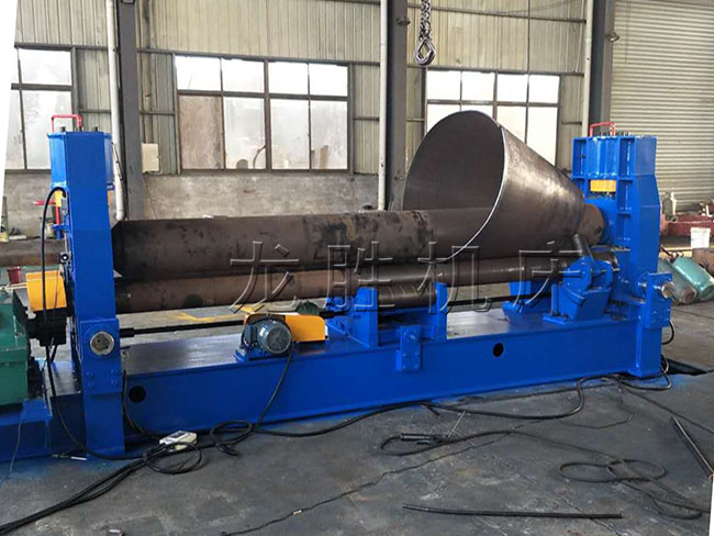 該機屬于液壓型三輥卷板機,用于常溫狀態(tài)下將各種容器用碳鋼、低合金鋼一次上料后不需調(diào)頭即完成板材端部預(yù)彎、卷圓和矯圓等工序。